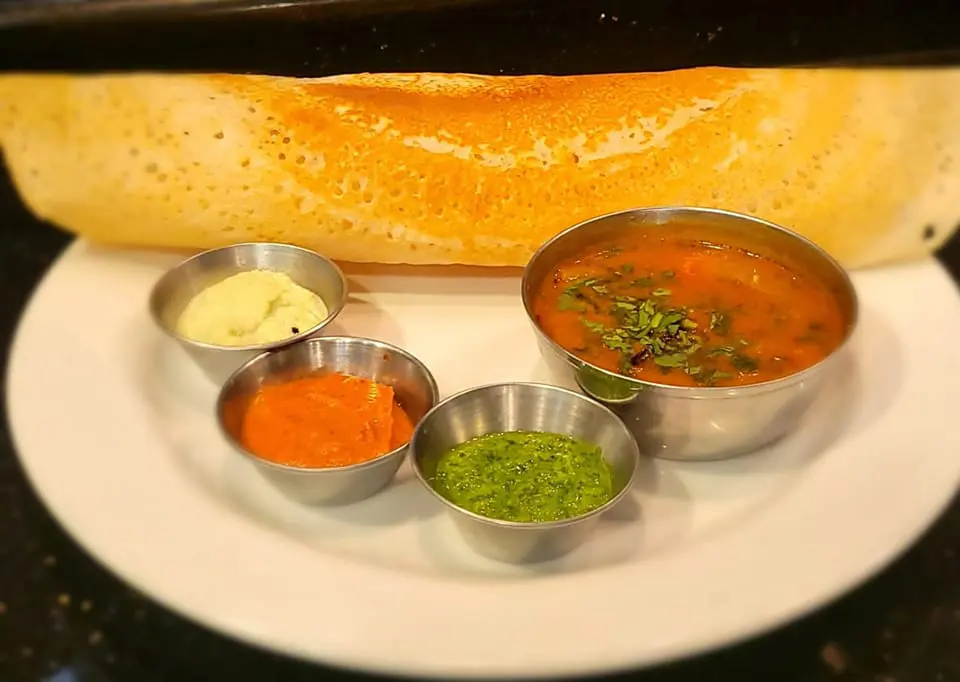 If you order only one thing, make it a Dosa! A dosa is a massive, paper-thin, savory crepe made from a fermented batter of rice and black lentils. It is cooked on a hot griddle until it achieves a perfect, golden-brown crispiness.